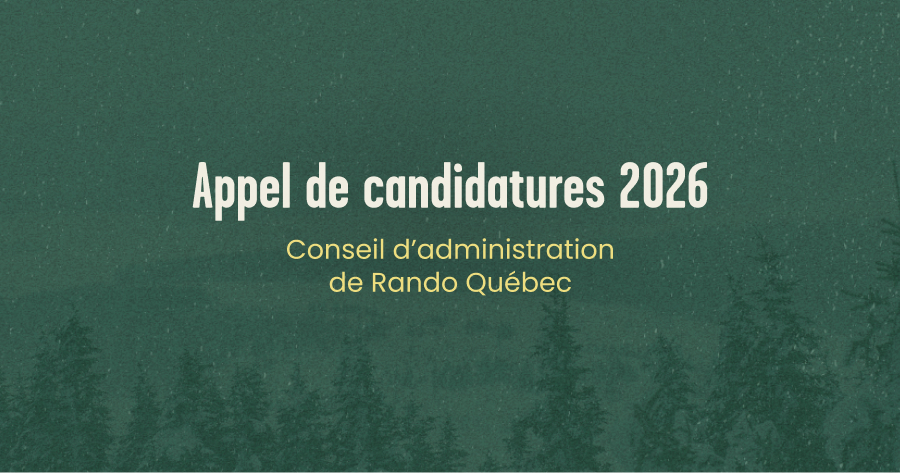 Rando Québec lance un appel de candidatures pour pourvoir cinq (5) postes d’administratrices ou d’administrateurs au sein de son conseil d’administration.